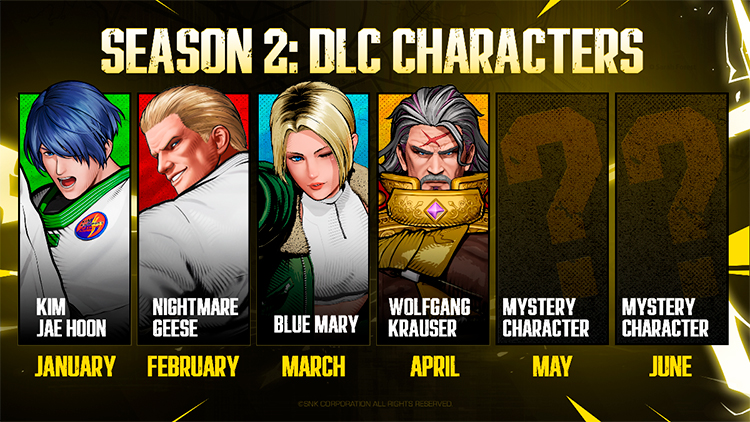Além deles, dois personagens misteriosos ainda não revelados completarão a temporada. A SNK informou que mais detalhes sobre esses lutadores inéditos serão divulgados futuramente.