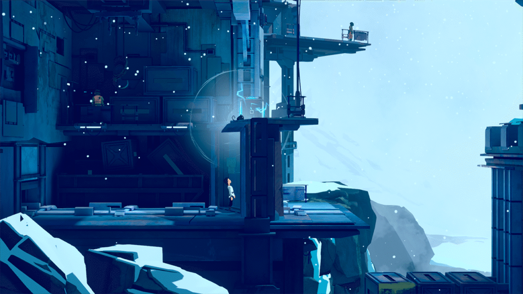 Em outros momentos, o foco vai mais para a tecnologia: controlar máquinas voadoras que conseguem segurar caixas e reposicioná-las, transformando o Mui num operador indireto do cenário. E como o jogo é bem bom em variar o contexto sem mudar a essência, ele troca o “puzzle de caixa” comum por uma solução que parece orgânica dentro do universo.