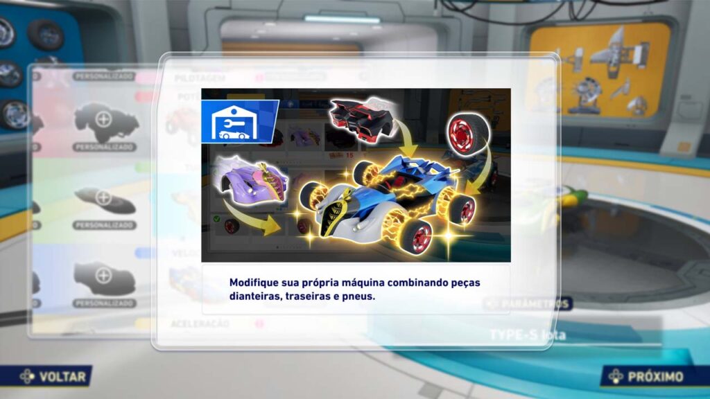 Outra mudança importante é a liberdade de personalização. Agora, os personagens não estão mais presos a veículos fixos: dá para combinar chassis, rodas e motores de diferentes estilos, além de customizar o visual com pinturas, adesivos e texturas. E, como um bônus nostálgico, os Extreme Gear, os hoverboards clássicos de Sonic Riders, estão de volta, oferecendo um estilo de corrida completamente diferente e cheio de personalidade.