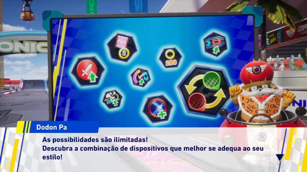 Antes de cada corrida, é possível equipar o veículo com dispositivos que afetam diretamente o desempenho. São dezenas de opções que podem aumentar a velocidade, alterar o comportamento dos itens ou até permitir começar a corrida com um power-up específico. Conforme o jogador avança nas competições, novos espaços para dispositivos vão sendo desbloqueados, abrindo espaço para combinações cada vez mais elaboradas.