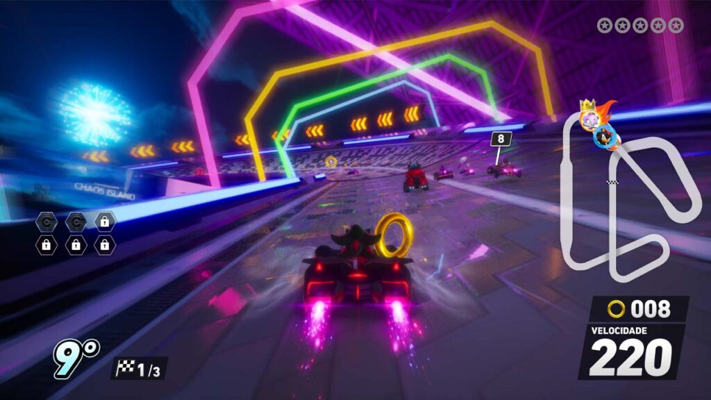 E esse excesso, aliás, pode ser um problema. Depois de cerca de uma hora jogando, comecei a sentir uma forte dor de cabeça. Não sei se foi pela velocidade absurda, pela quantidade de efeitos visuais ou pelo contraste intenso das cores, mas é algo que nunca havia sentido em outro jogo de corrida. O resultado é uma experiência visualmente sobrecarregada, que pode ser desgastante em sessões longas, mesmo para quem está acostumado com a correria do Sonic.